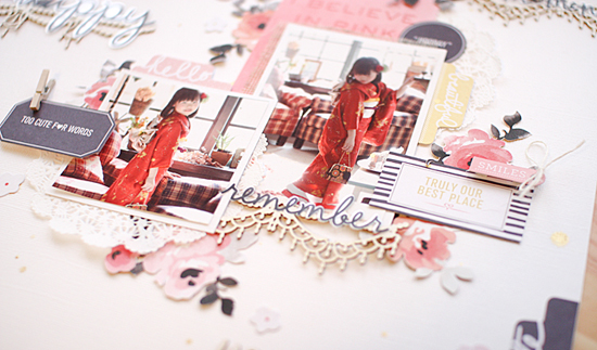 長女の着物の写真を使って、女の子が大好きな ピンク×黒を基調としたレイアウトを作りました。甘くなりがちなピンクも、ところどころに散った黒が全体をキュッと引き締めて、大人ガーリーな雰囲気にまとめてくれています。お気に入りポイントは、とても繊細なシャンデリアレースのチップボード。カットしてアクセントとして使用し、黒のワードステッカーを重ねています。