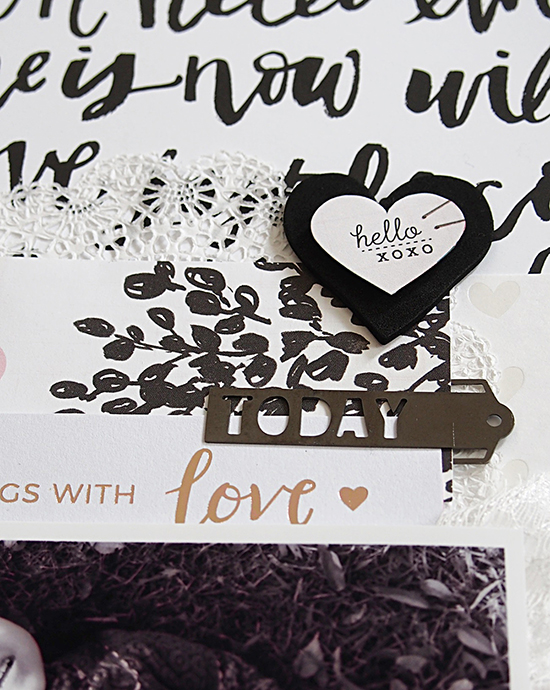 重くなりがちなモノクロ写真のレイアウトですが、白ベースに黒い手書き文字のペーパーレース・ハートなどの可愛いモチーフ、、と組み合わせ次第でとっても可愛らしいですね(^^)素材の質感の工夫がさりげなく効いています。