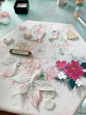 六角形キャンバスにテクスチャーをつけ着色をしてみました。イメージは桜だったのでほんのりな着色♡今回はディストレスインクにオキサイドをパレットで水に溶き筆で着色しています。