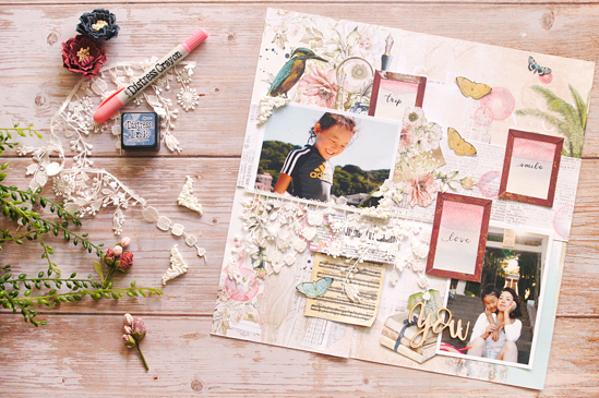 仕上げに「たらりん」レースとコーナーフレームを配置し、エレガント感を高めました。