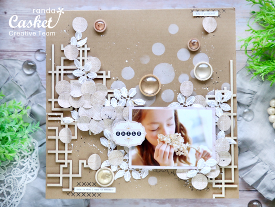 サークルのステンシルシート で 白い アクリル絵の具を ステンシル して、 カットした ウッド を 貼りました。写真の中でにおいを かいでいる アジサイの ドライフラワー (においしませんが ・・・。)の花びらのイメージ で、 バーラップ柄のペーパーを たくさんサークルパンチで抜き 、半分に折ります 。