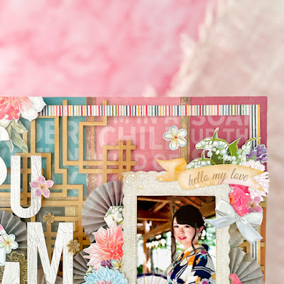 NAOちゃんの作品からのインスピレーション。【和】と【ヘキサゴン】をテーマに作った12インチレイアウトです。2022.6月号に入っていた英文字ワードのペーパーを台紙にA4ペーパーB面木目柄を使ってモチーフの境界線を格子のように仕上げ、その上に2022.4月号ウッドパネルの残りをゴールドに着色したものを重ねてベースを作りました。