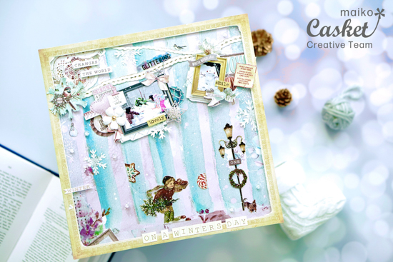 Mintayのペーパーのボーダーが白樺のようにみえたので、ペーパーから街灯や男の子をカットして冬の森っぽくしました。ペーパーからカットした雪の結晶とクリアのアルファベットビーズとスパッタリングでしんしんと雪が降るイメージをしてみました。